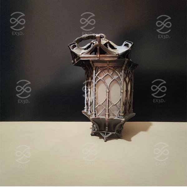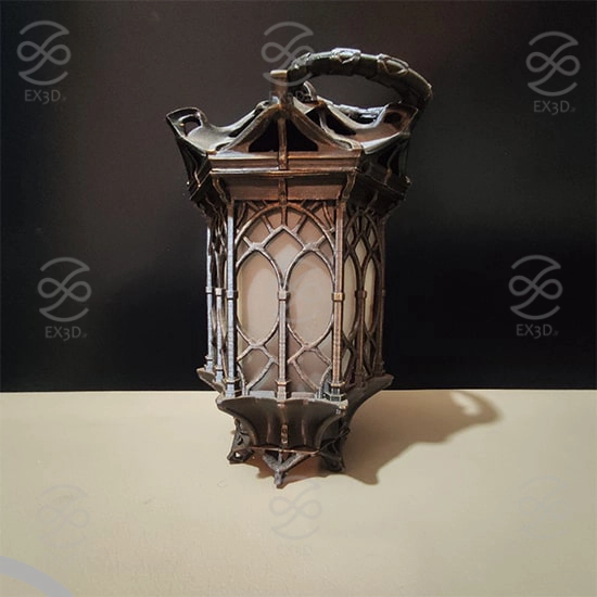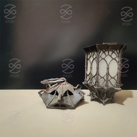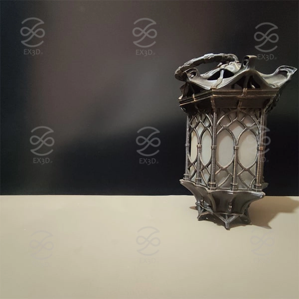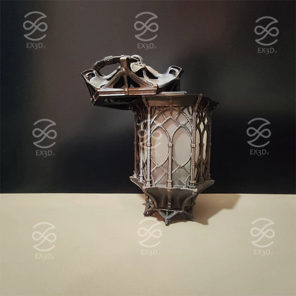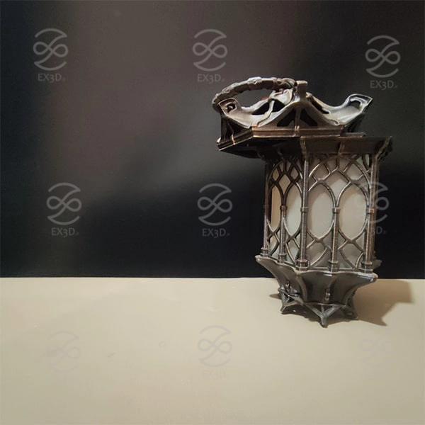 جنس فانوس از پلاستیک ABS انتخاب شده و نسبت به نور مستقیم خورشید و حرارت لامپ مقاوم است. جنس طلق نیز پلاستیکی اما جلوه ای شیشه ای و سنتی دارد. امکان تعویض طلق با رنگ دیگر و حتی استفاده از کاغذ رنگی به جای طلق وجود دارد. پس از چاپ شدن و در مراحل پرداخت از رنگ طلایی و مسی استفاده می شود و حالت آنتیک گونه ای دارد. با هر نوع لامپی که پایه ی E14 لوستری داشته باشد سازگار است.
